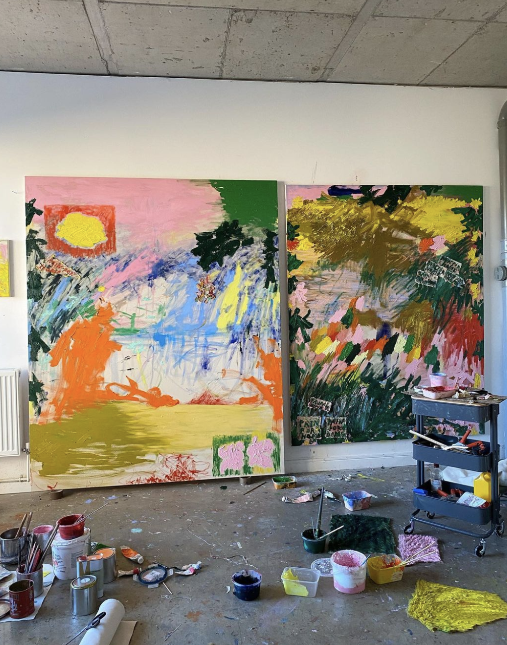 I have a very committed work ethic. I believe there is no time to waste and I find it very hard to stop working. I’m obsessed with painting and the feeling of completing a painting. I want to feel that over and over again, so I just keep going. I’ve always had a good work ethic since I was a kid cos I’ve always dreamed big. The only way for a working class kid to make it is if they dream big and don’t stop working. I think about painting and colour and texture a lot. I’m impulsive and manic when it comes to painting and I like to work quick and rough. Moments of reflection come later on in the work. I always lead with colour, emotion or nostalgia.